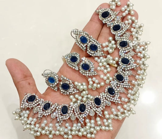 Regular price £25.99 GBPRegular priceUnit price / perSale price £25.99 GBPRuksar - 4 pieces choker set with jhumar, earrings and tikka available in 9 colours