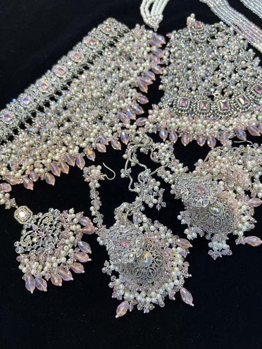 NISA - 5 Pieces set | Heavy Bridal set Inlcudes: Mala, Choker, Jhumar, Jhumke & Tikka | Baby pink on silver base