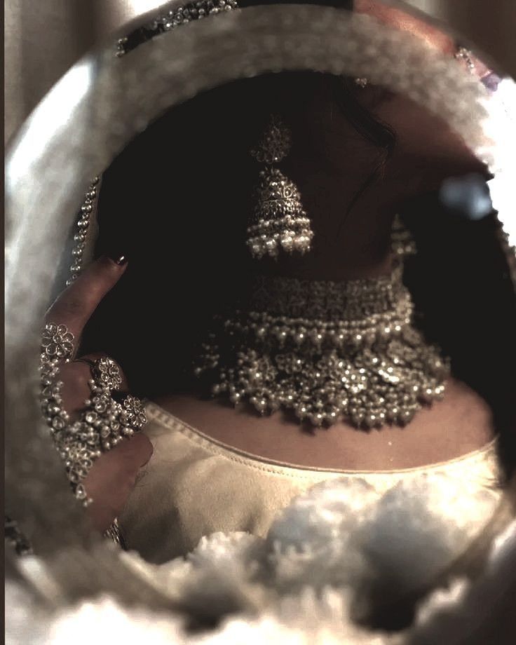 NISA - 5 Pieces set | Heavy Bridal set Inlcudes: Mala, Choker, Jhumar, Jhumke & Tikka | Baby pink on silver base