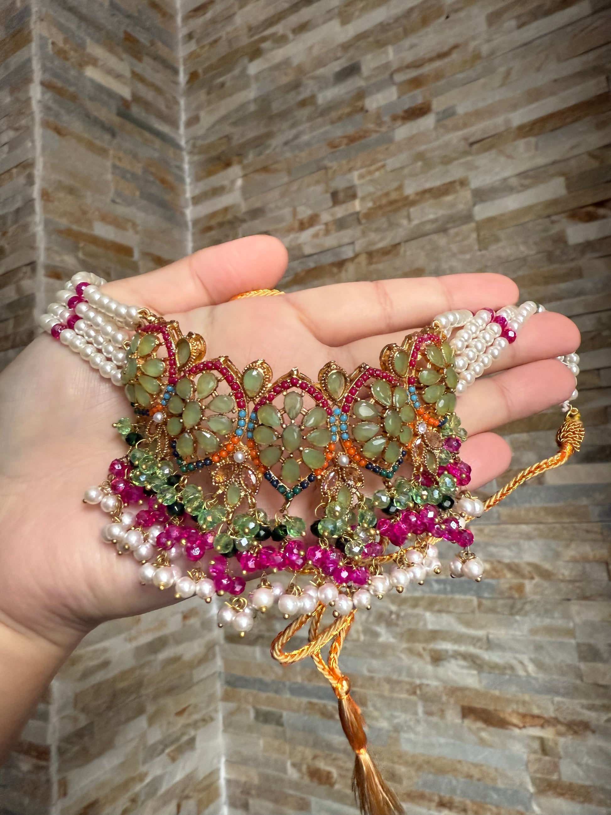 The MARJAAN Choker set comes with matching earrings and tikka, available in 10 stunning colours. Elevate your outfit with this elegant set that adds a touch of sparkle to any look. Expertly crafted and versatile, this set is perfect for any occasion.