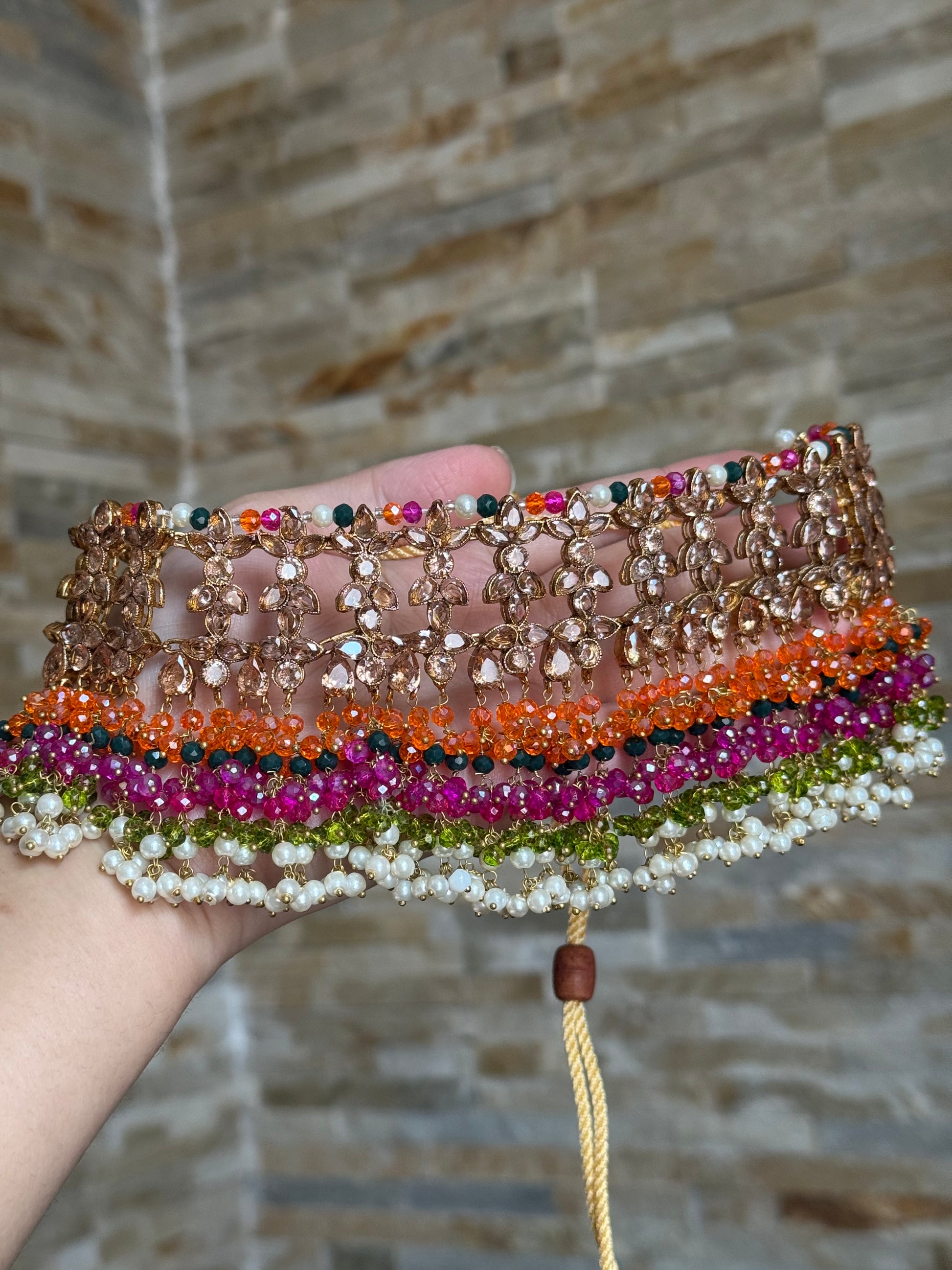 "Get ready for your special day with the PIYA Mehndi Bridal set. This set includes a beautifully crafted choker, jhumke earrings, and a tikka headpiece. Contact us on Instagram @Ammysglamour or WhatsApp for customisation options. Elevate your bridal look with this stunning set."